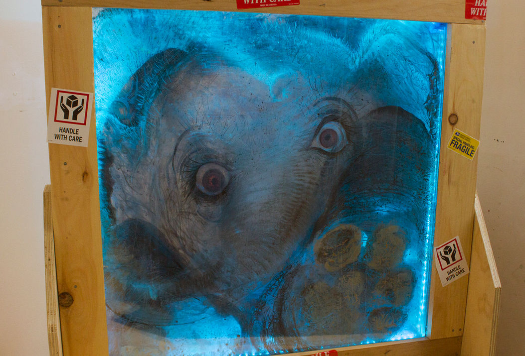 plexiglass, a baby elephant stares out from a shipping crate. But